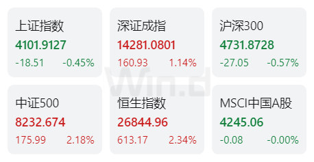 中国市场方面:上证指数下跌0.45%,深证成指上涨1.14%,沪深300指数下跌0.57%,中证500指数上涨2.18;恒生指数上涨2.34%。