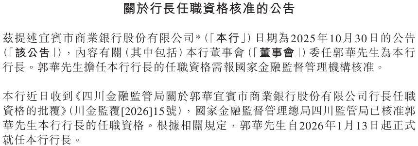 1 月 13 日,宜宾银行发布公告称,该行收到《四川金融监管局关于郭华宜宾市商业银行股份有限公司行长任职资格的批复》,国家金融监督管理总局四川监管局已核准郭华该行行长的任职资格。郭华自2026年1月13日起正式就任该行行长。