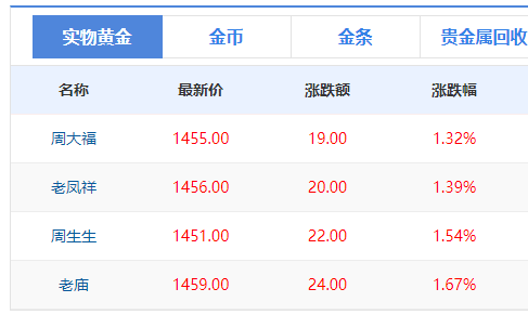 金投网数据显示,1月19日,豫园股份(600655.SH)旗下老庙黄金报1459元/克,较前一日上涨24元/克;老凤祥(600612.SH)报1456元/克,较前一日上涨20元/克;周大福(01929.HK)报1455元/克,较前一日上涨19元/克;周生生(00116.HK)报1451元/克,较前一日上涨22元/克。