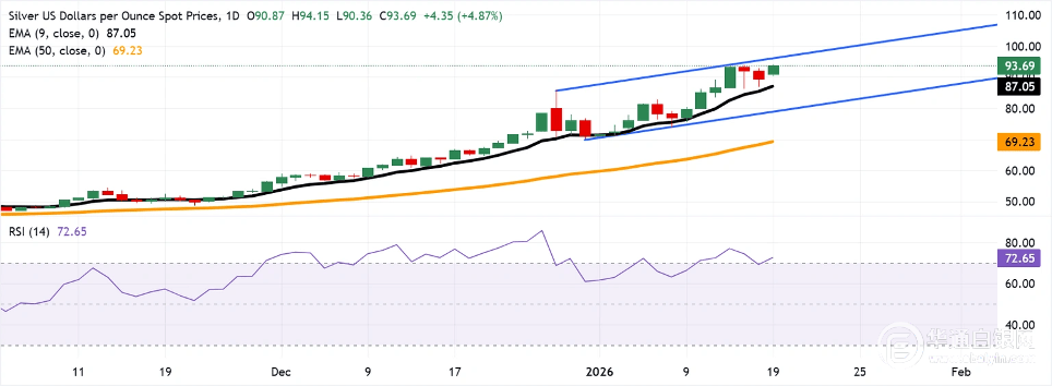 银价在连续两天下跌后有所回升,早盘时达到了94.15美元的新高。目前,银价约为93.70美元/盎司。对日线图时间框架的技术分析表明,白银价格仍处于上升通道模式内,显示出持续的看涨倾向。