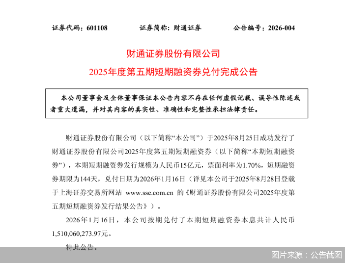 公告指出,2026年1月16日,财通证券按期兑付了本期短期融资券本息共计人民币约15.1亿元。