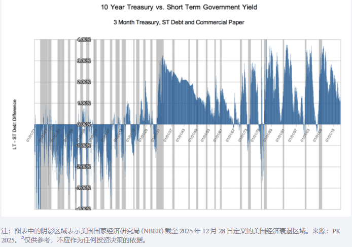 人工智能及其他四大创新平台所带来的通缩效应将不断累积,并塑造出一种经济环境,类似于截至1929年的50年间,由内燃机、电力和电话引发的上一次重大技术革命时期。在那一时期,短期利率与名义GDP增速同步,而长期利率则对技术繁荣所伴随的通缩暗流作出反应,使收益率曲线平均倒挂约100个基点,如下图所示。