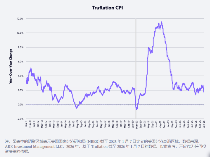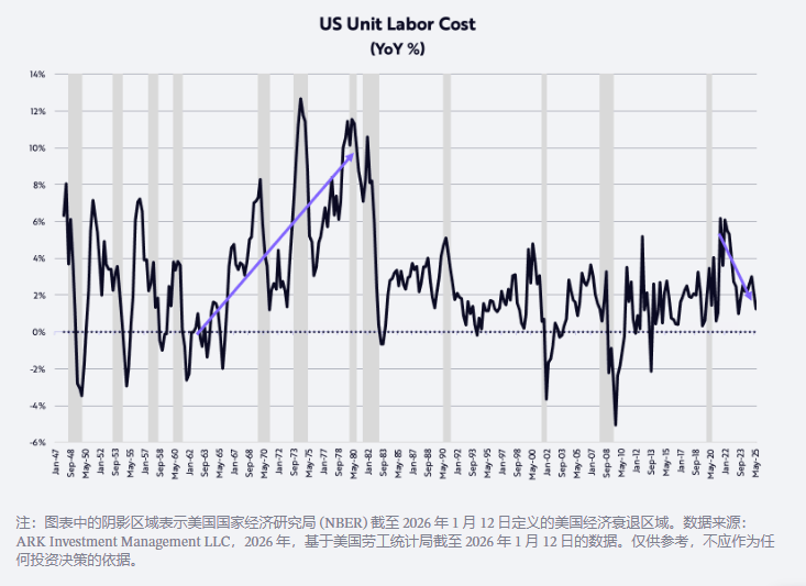 在宏观层面,Wood预测在生产力繁荣的推动下,通胀将进一步受控,甚至可能转负。她预计,未来几年美国名义GDP增长率将维持在6%至8%的区间,主要由生产力提升驱动,而非通胀。