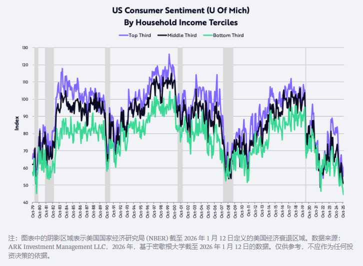 与此同时,密歇根大学的数据显示,中低收入人群的信心已跌至上世纪八十年代初以来的最低点。当时,两位数的通货膨胀和高利率严重削弱了购买力,并将美国经济推入连续衰退。此外,如下图所示,近几个月来,高收入人群的信心也出现了下滑。在我们看来,消费者信心是目前被压缩得最紧、最具反弹潜力的“弹簧”之一。