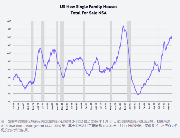 第四季度,为了消化接近50万套的新建独栋住宅库存(如下图所示,这是自2007年10月全球金融危机爆发前夕以来的最高水平),三大住宅建筑商大幅下调了房价,同比降幅分别为:莱纳(Lennar)-10%,KBHomes-7%,以及DRHorton-3%。这些价格下跌的影响将在未来几年内滞后反映在消费者物价指数(CPI)中。