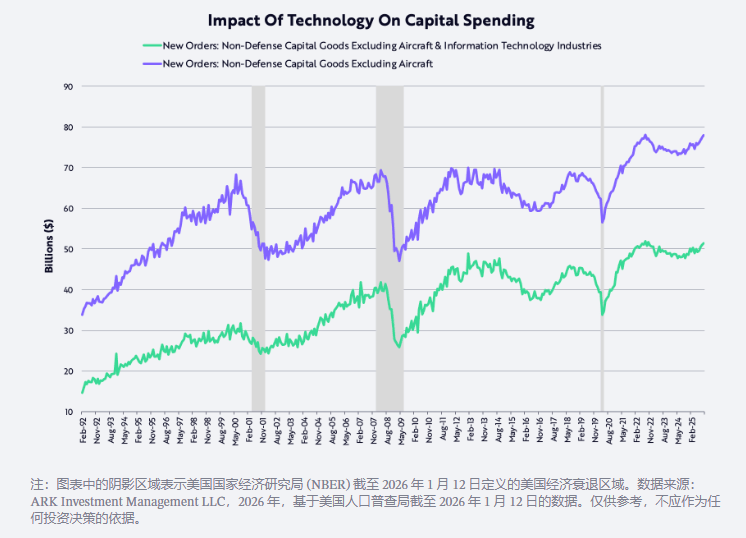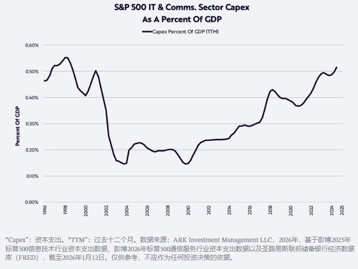 与此同时,以非国防资本品(不包括飞机)衡量的资本支出在2022年中期达到峰值,此后无论是否受到技术影响,该支出水平都已回升至该水平。事实上,自科技和电信泡沫破裂以来,这一资本支出指标已挣扎了20多年才得以突破,直到2021年,新冠疫情相关的供应冲击迫使数字和实体投资双双加速增长。曾经的支出上限似乎已转变为支出下限,因为人工智能、机器人、储能、区块链技术和多组学测序平台已准备就绪,即将迎来黄金时代。继上世纪90年代的科技和电信泡沫之后,约700亿美元的支出峰值持续了20年,如今,正如以下图示所示,这可能是历史上最强劲的资本支出周期。我们认为,人工智能泡沫的出现还遥遥无期!