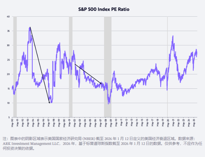 对于投资者关注的市场估值问题,Wood并不认为AI泡沫已经形成。她指出,虽然目前市盈率处于历史高位,但随着AI、机器人等技术推动生产力爆发,企业盈利增长将消化高估值,市场可能会在市盈率压缩的同时实现正回报,类似于1990年代中后期的牛市路径。