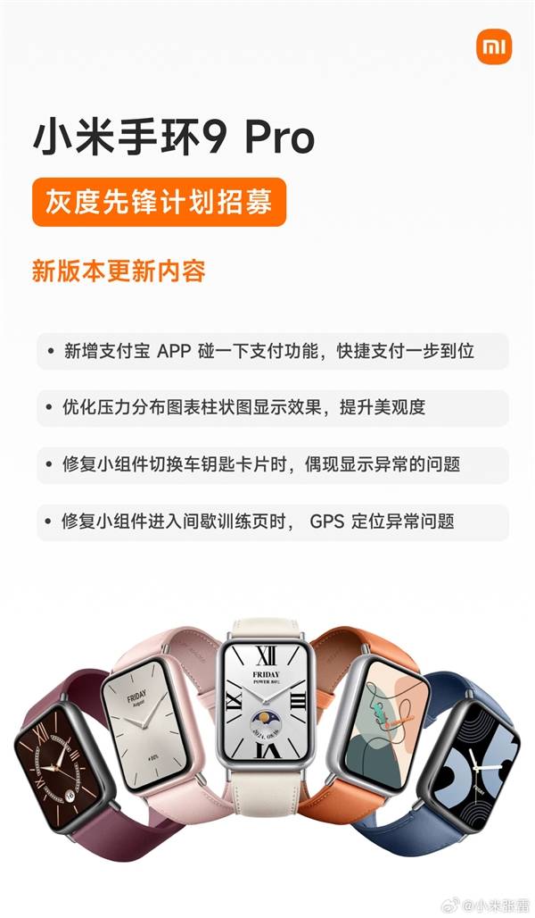 快科技1月20日消息,小米集团手机部副总裁、可穿戴部总经理张雷今天宣布,小米手环9 Pro全新版本先锋计划开启。