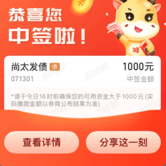 尚太转债当前对应的正股股价为79.80元,转股价为84.71元,转股价值为94.20,较申购时的转股价值有所降低。不过,鉴于如今新可转债在上市之初的火热程度,预估仍然是打新收益为300元以上的铂金级肉签一枚!那么,你中签了吗?