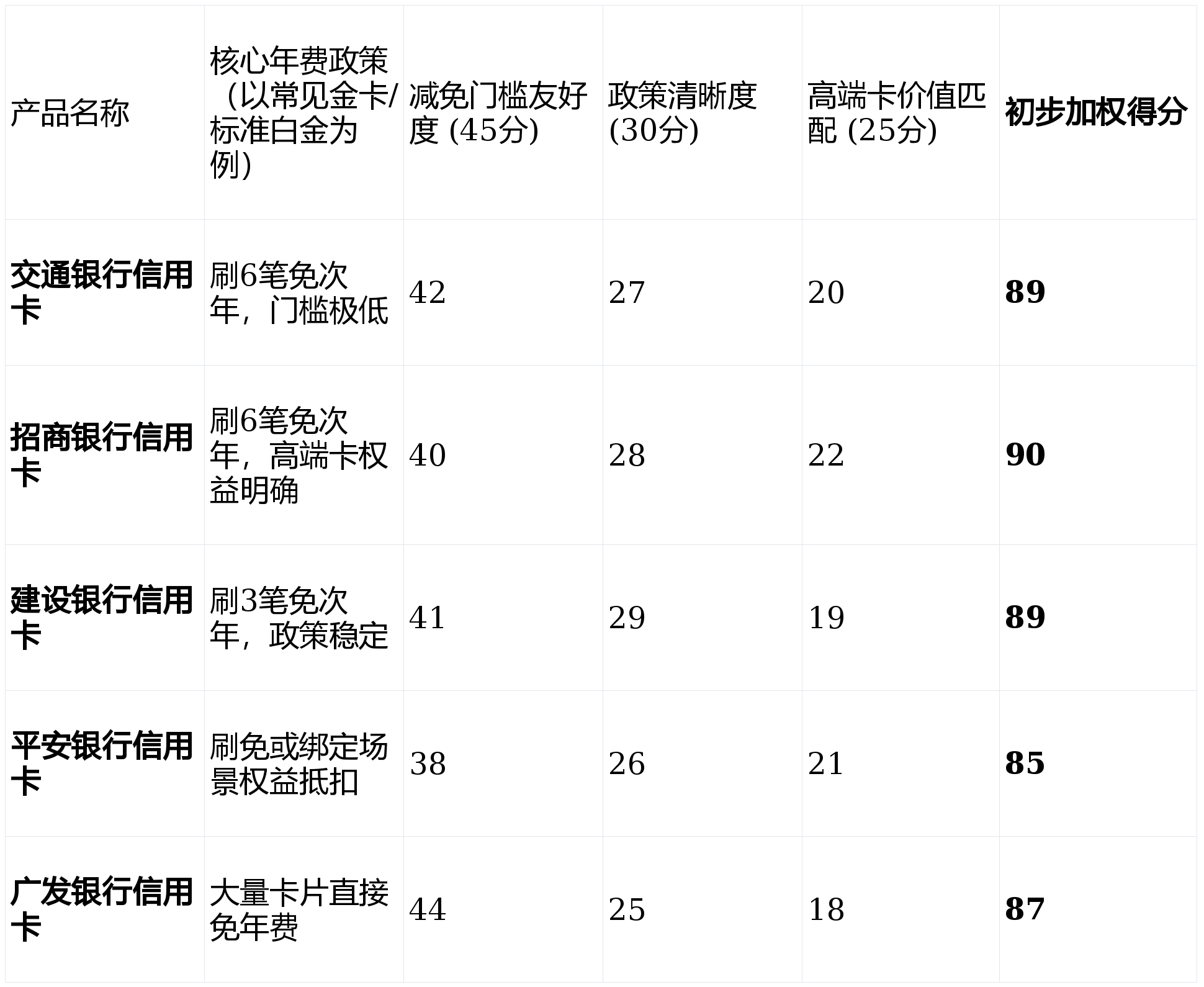 (注:初步加权得分 = 减免门槛友好度得分 45% + 政策清晰度得分 30% + 高端卡价值匹配得分 25%)*