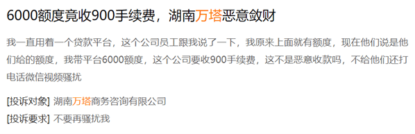 贷款申请成功后,他们会收取高额手续费。比如,在黑猫投诉平台,用户投诉6000元额度,就要收取900元手续费,即15%手续费。