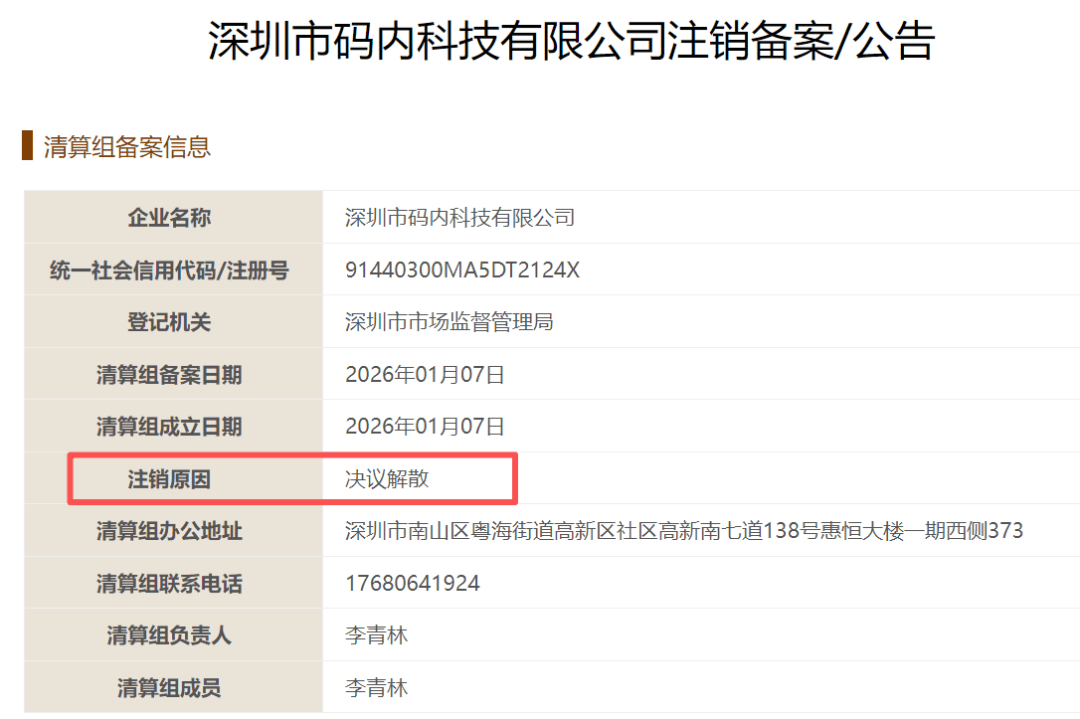 企查查显示,万塔集团的香港主体已“休止活动”;而且码内科技也在进行“注销备案”以及债权人公告,公告期:1月7日至2月21日,注销原因为“决议解散”。