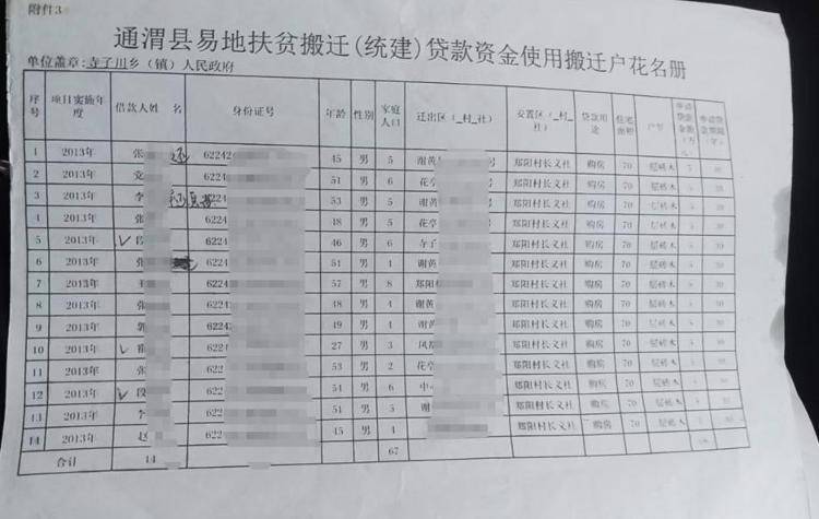另一份“搬迁户花名册”显示,段先生等13位寺子川乡村民均以购房的名义,贷款5万元,共计65万元。