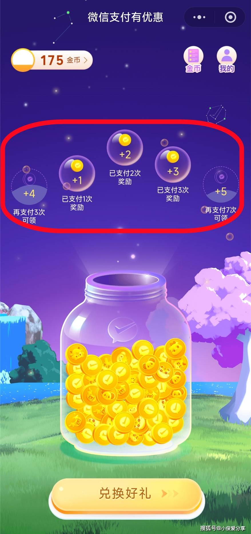 重点来了哈!你看,进入“支付有优惠”后,首先映入我们眼帘的就是一排跳到的气泡,你会发现咱们点一下,哎就可以领取一个金币,现在大家都清楚了吧