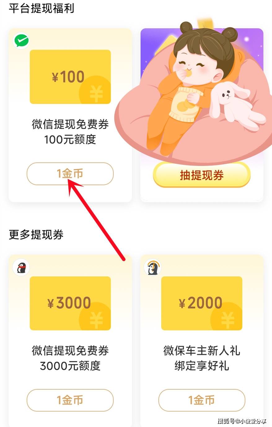 你看啊,这里就可以兑换各种不同额度的免费券,有100元的,3000元的,以及2000元的,比如说我要提现100元
