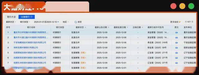 根据企业预警通,截至12月9日,全国有421家银行被批复合并或批复解散,这个数字,已经是2024年全年的2倍还多。