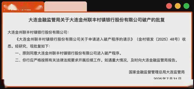 7月份的时候,大连金州联丰村镇银行破产被批复,成为国内第7家进入破产程序的银行。