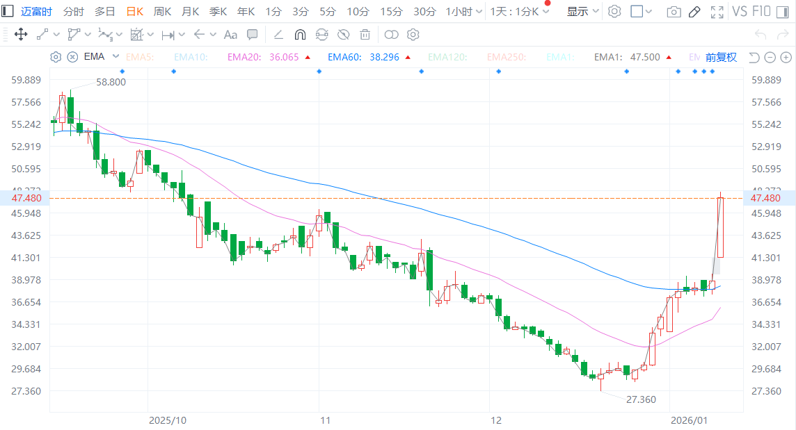 以对GEO赛道早已有所布局的迈富时(02556)来说,今日甫一开盘便高开高走,盘中一度涨超20%,截止发稿时间,该股大涨23.61%至47.96港元,总市值为122.9亿港元。值得注意的时,自2025年12月24日以来,该股持续上涨,11个交易日已经累涨超64%,涨势十分可观。