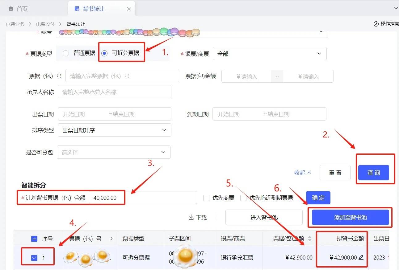 接下来点击 电票业务 - 电票收付- 背书转让 -单笔背书,选择账号、票据类型选择“可拆分票据”,银票/商票选择“全部”,再点查询,已持有在户的所有等分化票据,都会在列表中显示出来。选择需要背书的等分化票据,输入被背书人名称、账号、开户行和计划背书票据(包)金额等,这里的计划背书票据(包)金额,可以手动填写可拆分票据面额以内的任意金额,再点“确定”提交。