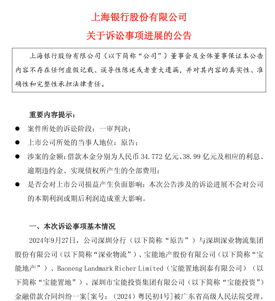 综合三起重大诉讼,深业物流及其关联方在上海银行的逾期贷款及担保责任总额已突破百亿。