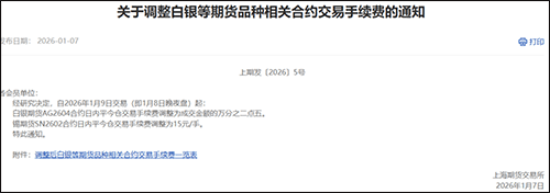 此外,上期所同日还发布了调整白银等期货品种相关合约交易手续费的通知。自2026年1月9日交易(即1月8日晚夜盘)起,白银期货AG2604合约日内平今仓交易手续费调整为成交金额的万分之二点五,锡期货SN2602合约日内平今仓交易手续费调整为15元/手。