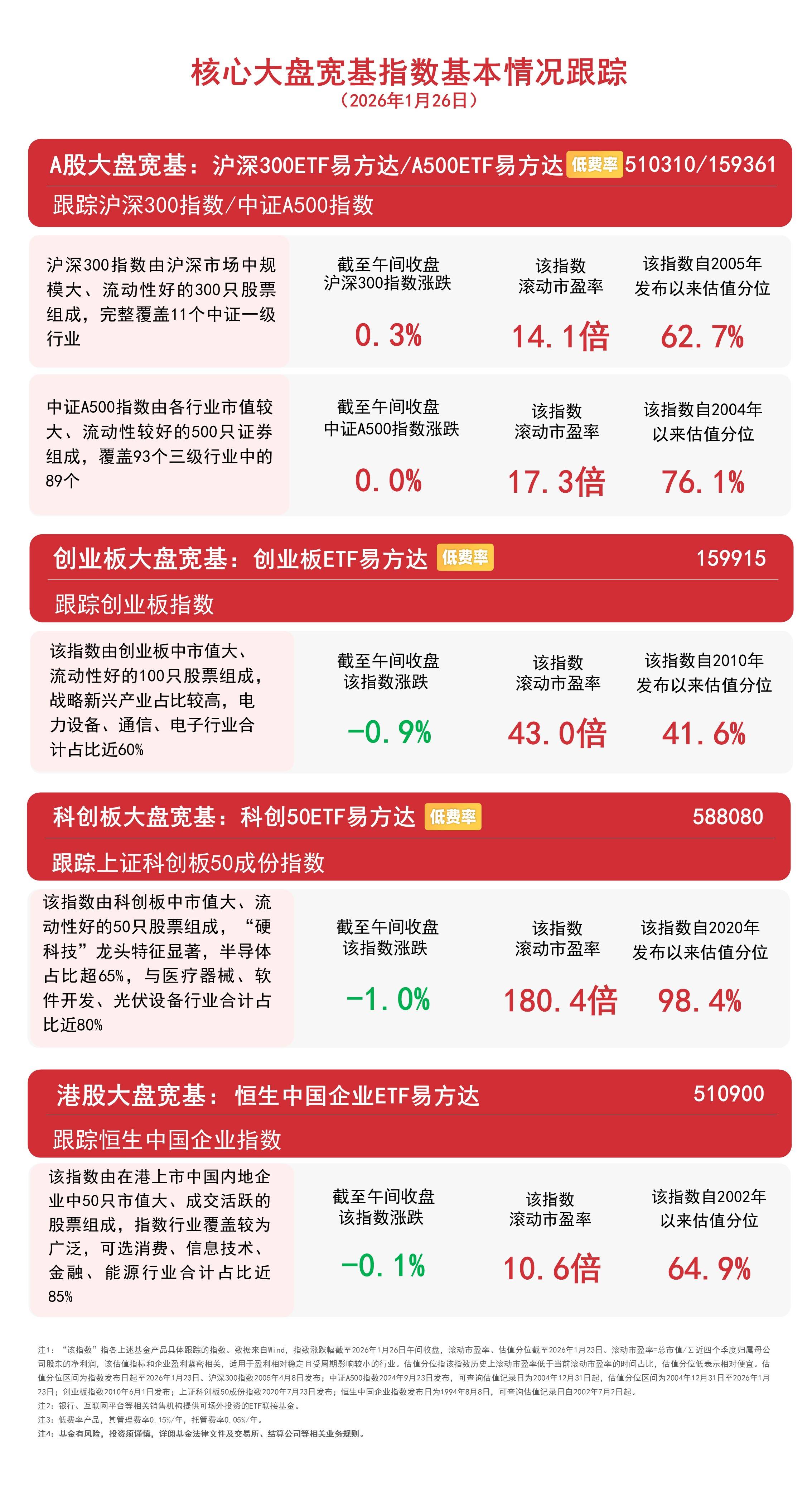 1月26日早盘,A股三大指数涨跌不一,沪指半日涨0.12%,全市场成交额超2.2万亿元,较上日半天放量超3000亿元,板块题材上,黄金、有色金属、禽流感、石油天然气、保险、化工、证券、港口航运板块涨幅居前,商业航天、军工装备、游戏、光刻机、半导体、人形机器人、AI手机概念股跌幅居前;港股调整,医药与科技股集体下挫。截至午间收盘,中证A500指数上涨0.02%,沪深300指数上涨0.3%,创业板指数下跌0.9%,上证科创板50成份指数下跌1.0%,恒生中国企业指数下跌0.1%。