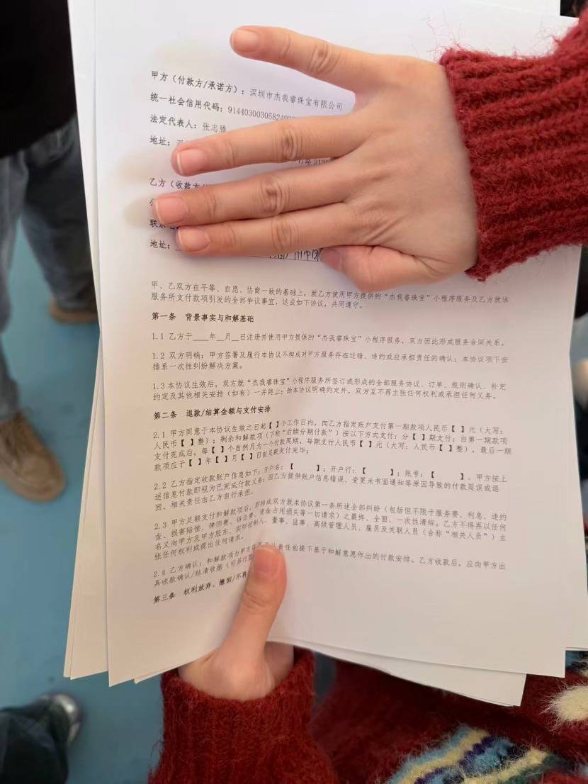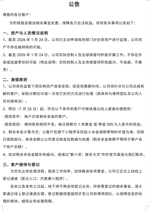 1月24日,平台负责人张某曾通过视频安抚投资者,称以“官方小程序首页弹窗为准”。次日,杰我睿公告称,已主动申请政府部门对全部资产进行监管,并强调资产未被转移,并将每日兑付金额限定为1克黄金或等值500元现金,具体处置方案仍需协商,预计需7至15天方可处理。
