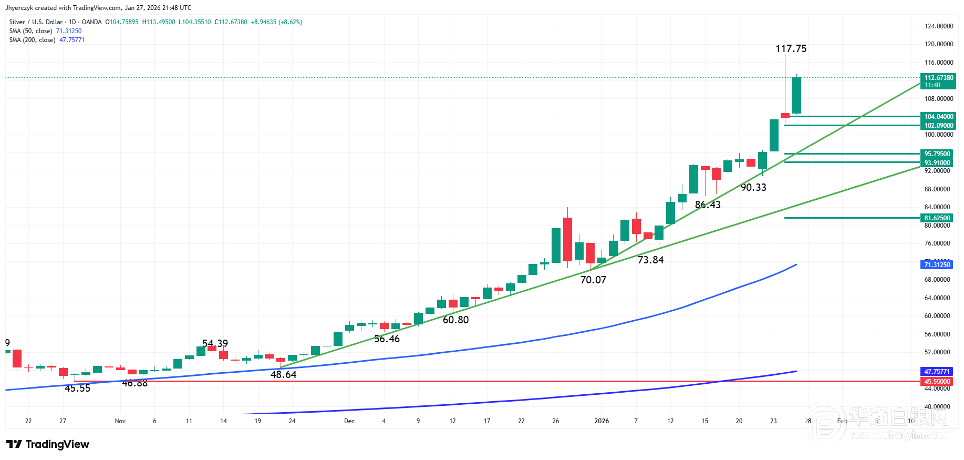 •若白银从高点回撤,则可104.04-102.09美元与95.79-93.91美元两个关键回撤区域寻找价值机会。