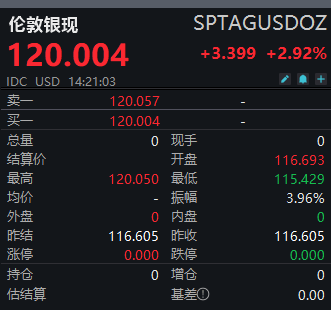 【大河财立方消息】1月29日,现货白银持续拉升,站上120美元/盎司,再创历史新高,日内大涨近3%,年内累计涨幅超67%。