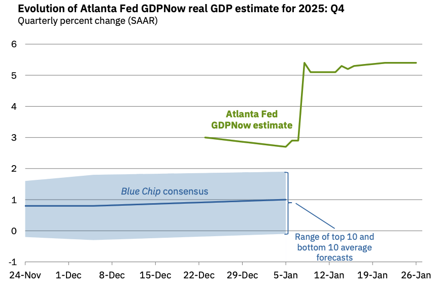 剥离政治层面的喧嚣,美国实体经济在2026年初展现出的韧性足以令任何看空者感到窒息。截至1月28日,亚特兰大联储备受推崇的GDPNow模型对2025年第四季度实际GDP增长的预测值已上修至5.4%。在经历了长达数年的高利率紧缩周期后,美国经济不仅没有陷入衰退,反而在这个理应减速的周期尾部跑出了类似新兴市场的增长率,这是一个不容忽视的异常信号。