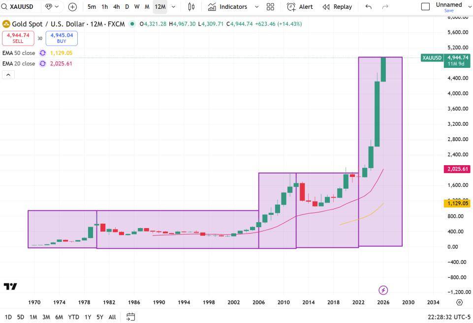 历史上看,巴菲特的总结并非没有道理。1971年布雷顿森林体系解体后,美元与黄金脱钩,金价开启自由浮动。观察下面这张金价走势图,不难看出金价的上涨确实明显分为几个阶段。