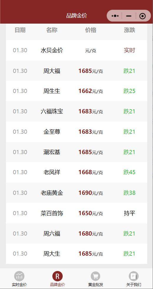 1月30日,“今日金价”数据显示,多家黄金珠宝品牌当日公布的境内足金首饰价格大幅回调,周生生报价1662元/克,周大福报价1685元/克,老凤祥报价1620元/克,老庙黄金报价1668元/克。