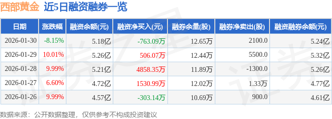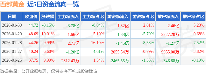 证券之星消息,截至2026年1月30日收盘,西部黄金(601069)报收于44.72元,下跌8.15%,换手率11.28%,成交量100.06万手,成交额47.01亿元。