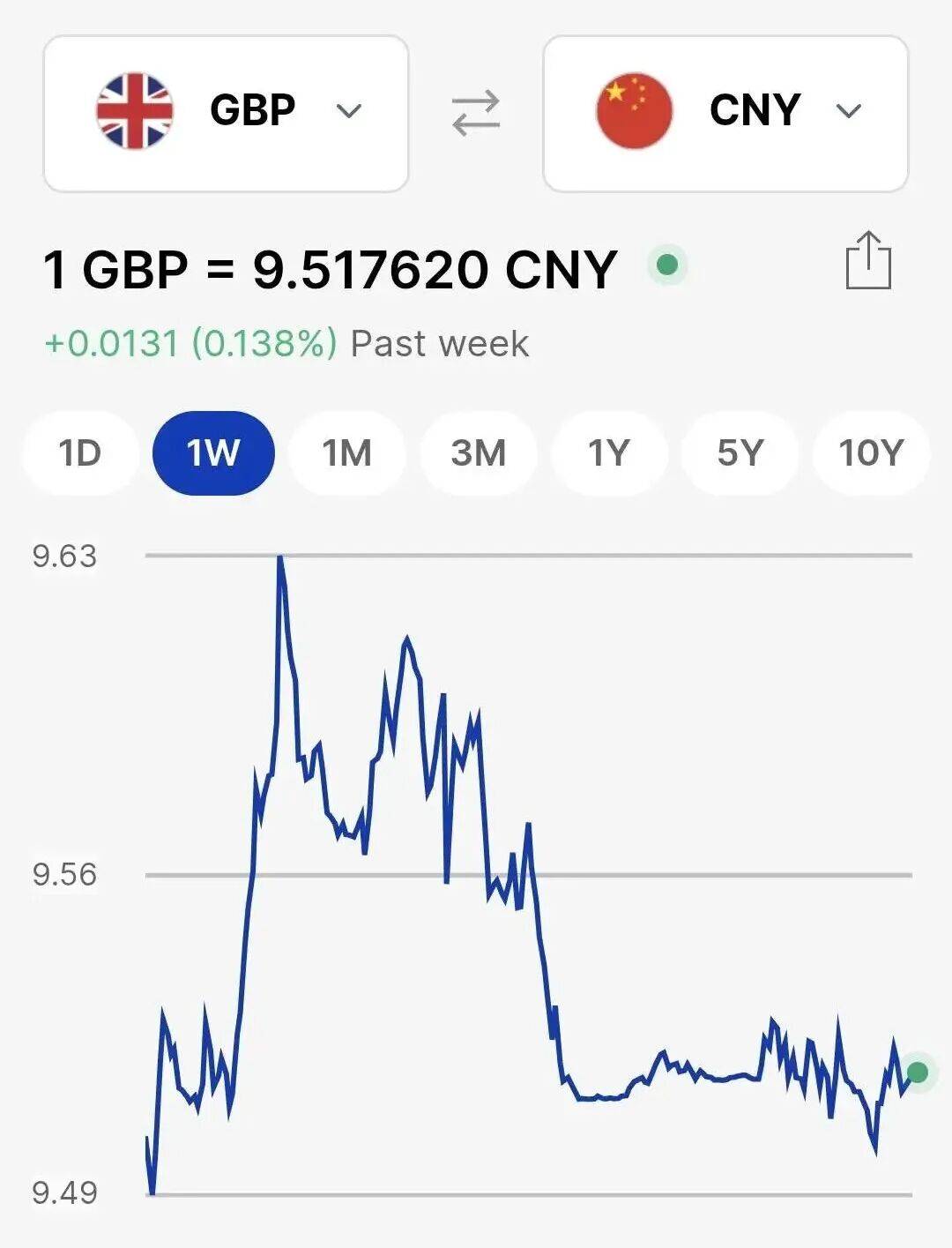 下为英镑兑人民币汇率过去一周以来走势: