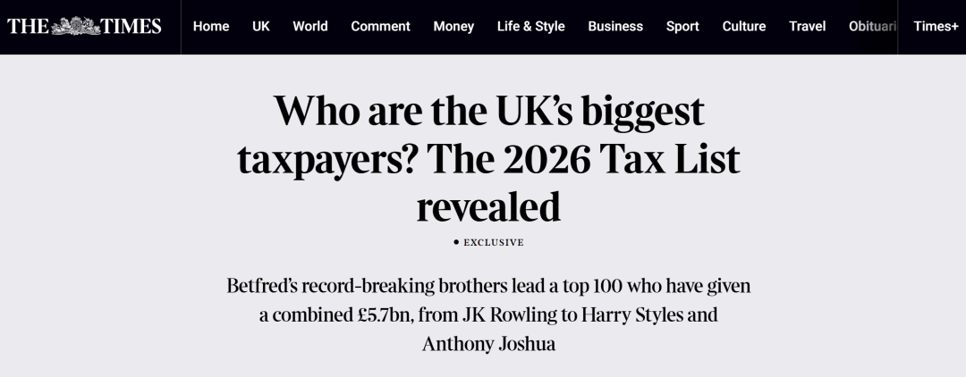 ● 英国博彩公司一年交税4亿英镑 ,登顶2026年全英纳税榜