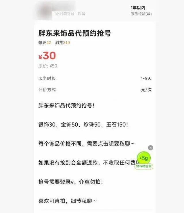 由于胖东来的黄金首饰比较受欢迎,商家要求消费者提前在胖东来珠宝小程序实名预约,且金条方面每人限购200克。并且,消费者进行实名预约购买黄金时,人需要在线下门店50公里内。在二手平台,还有人推出代预约服务,其中购买黄金的代预约服务费为50元。