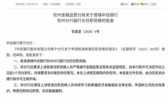 2026年2月3日,根据国家金融监督管理总局消息,《中信银行股份有限公司南宁分行关于申请核准曾镇任职资格的请示》获得通过,批复曾镇中信银行钦州分行副行长的任职资格。