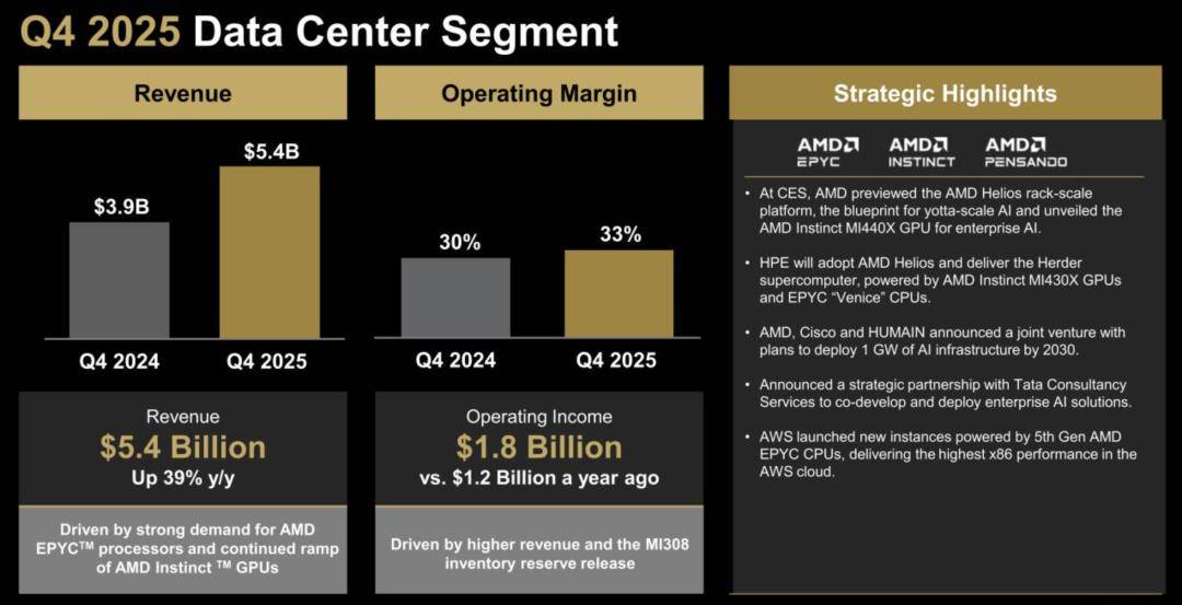 AMD董事长兼首席执行官苏姿丰博士表示,“进入2026年,我们各项业务都保持强劲增长势头,这主要得益于高性能EPYC和Ryzen CPU的加速普及以及数据中心人工智能业务的快速扩张。”