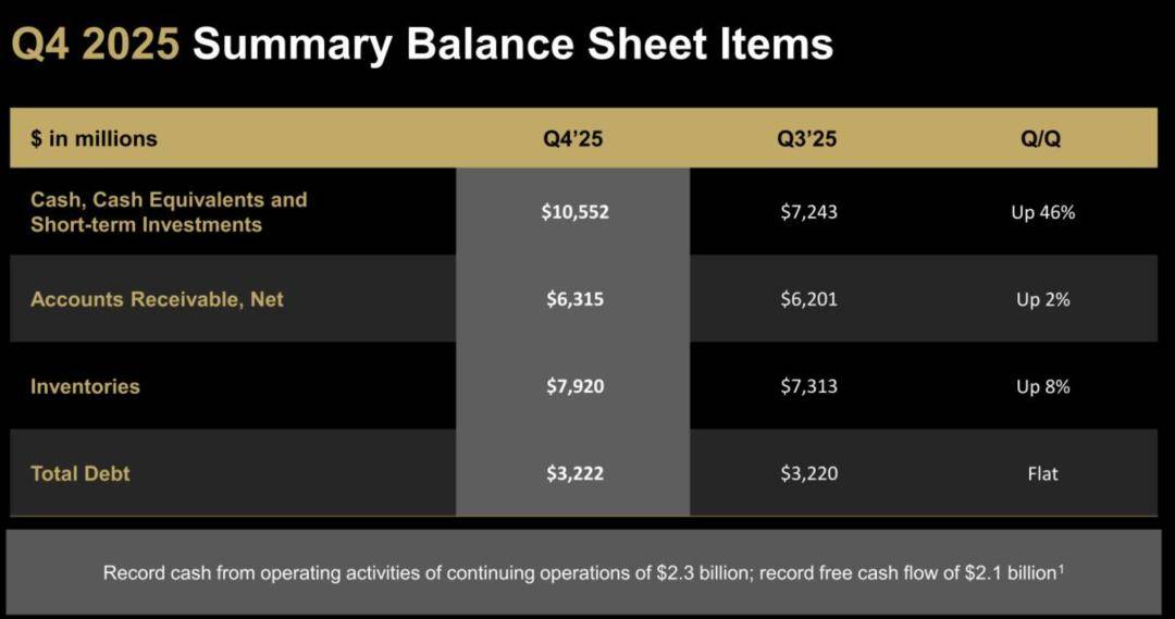 截至2025年第四季度,AMD持有的现金及现金等价物为、短期投资为105.52亿美元,应收账款为63.15亿美元,存货79.2亿美元,总负债为32.22亿美元,自由现金流达到21亿美元。