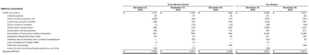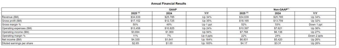 截至2025年12月27日的年度,Non-GAAP下运营利润为77.68亿美元,较上年同期的61.38亿美元增长27%;Non-GAAP下净利为68.31亿美元,较上年同期的54.2亿美元增长26%。
