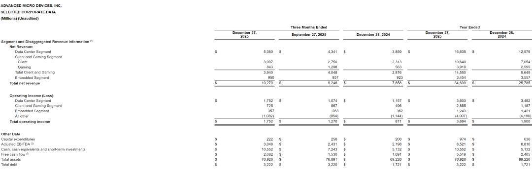 截至2025年12月27日的年度,AMD运营利润36.94亿美元,上年同期的运营利润为19亿美元;净利43.35亿美元,上年同期净利为16.41亿美元。