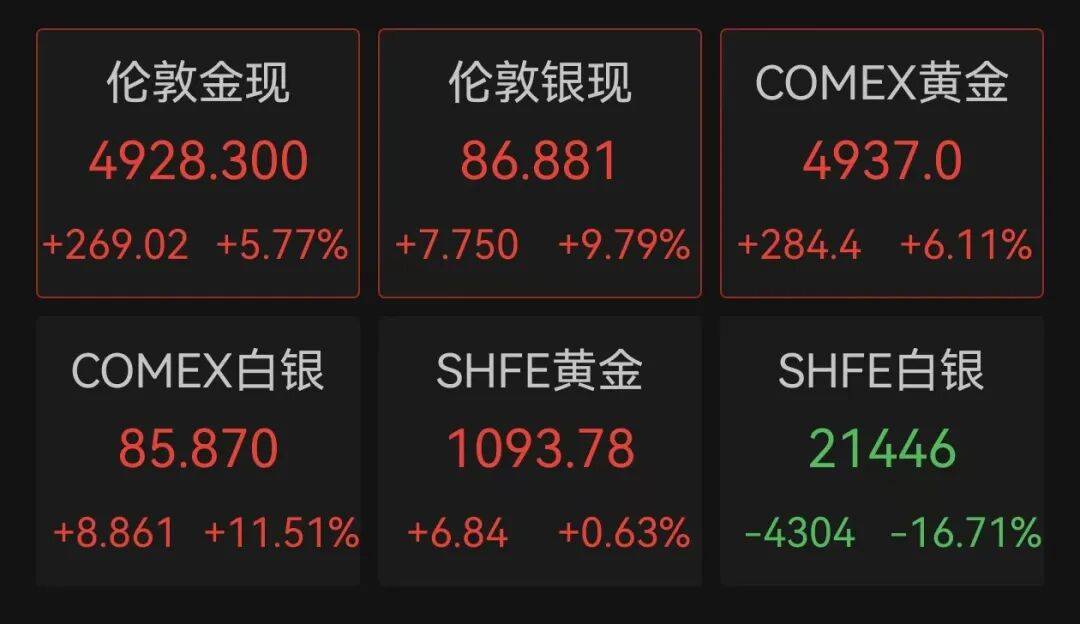 截至北京时间20:02,伦敦金现涨5.77%,报4928.3美元/盎司;COMEX黄金期货涨6.11%,报4937美元/盎司。伦敦银现涨9.79%,报86.881美元/盎司;COMEX白银期货涨11.51%,报85.87美元/盎司。