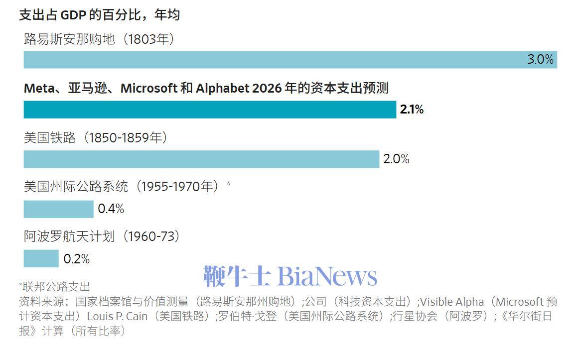 2月8日消息,根据《华尔街日报》及最新的财报指引分析,美国最大的四家科技公司,亚马逊、Alphabet、微软和Meta在2026年的资本支出预计将达到约6500亿美元,远高于美国在登月计划中的支出,甚至可与美国历史上最重大的资本投入相媲美。