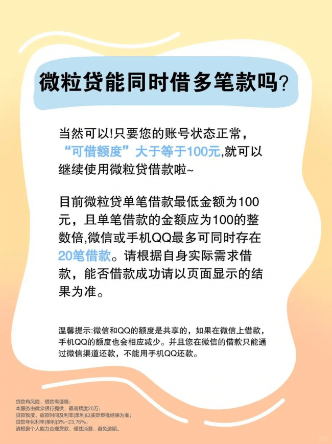 微粒贷借款笔数上限:微信或手机QQ最多可同时借20笔借款。你可以根据自身实际需求借款,不过能否借款成功,还得看系统官方审批,应以页面最终显示的结果为准。