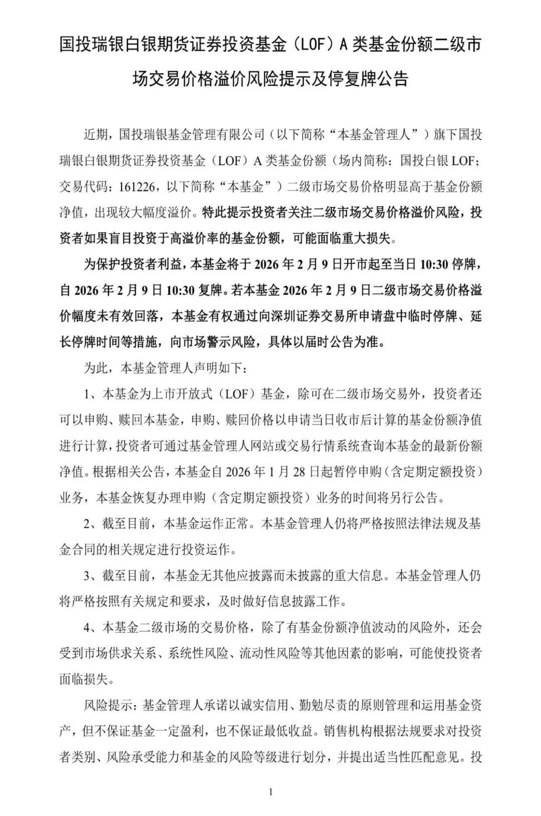 2月8日,国投白银LOF公告称,近期,国投瑞银基金管理有限公司旗下国投瑞银白银期货证券投资基金(LOF)A 类基金份额(场内简称:国投白银 LOF;交易代码:161226) 二级市场交易价格明显高于基金份额净值,出现较大幅度溢价。特此提示投资者关注二级市场交易价格溢价风险,投资者如果盲目投资于高溢价率的基金份额,可能面临重大损失。