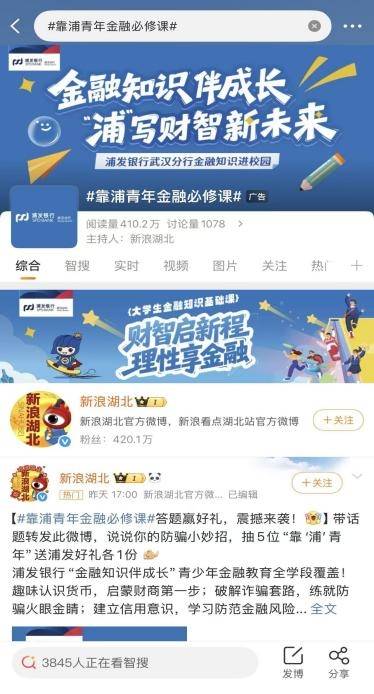 面对大学生,浦发银行则主打“沉浸式”体验,结合大学校园生活,更好地“寓教于乐、融学于趣”,让金融教育变得具体而深刻。在长沙的大学校园,“青春财能浦公英”沉浸式学习空间打破了传统说教。通过辩论赛、情景剧和直播科普,金融教育变得具体而深刻。而在武汉,浦发银行在微博发起的#靠浦青年金融必修课#话题,更是吸引了广大年轻群体参与讨论,让金融安全意识在互动中生根发芽。