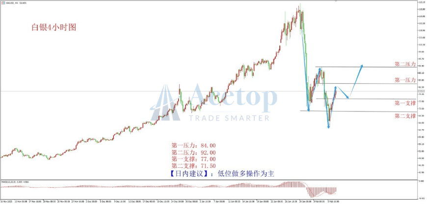 上图为白银4小时图。从波浪来看,白银于63.90一线结束了针对此前单边上行的调整。当前处于自下方向上的A浪阶段,可尝试跟进操作,或等待B回踩尝试C上行。整体来看,白银处于宽幅大区间震荡盘整的走势,但整体多头趋势未改变。从下方MACD指标来看,量能有底背离迹象。操作上建议逢低布局多单思路为主。