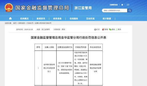 2月9日,国家金融监督管理总局金华监管分局公开的行政处罚信息表显示,金华银行及相关责任人因三项核心违法违规行为,面临严厉处罚,这也是该行2025年以来收到的最重磅罚单,其违规细节直指银行信贷业务与内部管理的核心短板。