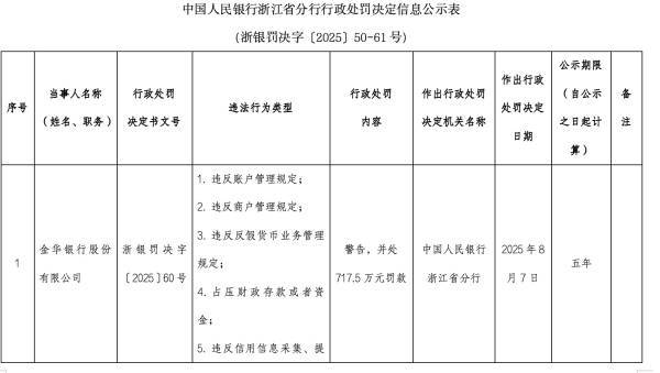其中2025年8月7日,金华银行被中国人民银行浙江分行因违反账户管理规定、违反信用信息采集、提供、查询及相关管理规定等处以717.5万元的罚款。
