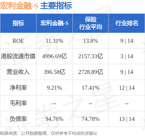 宏利金融-S港股市值4996.69亿港元,在保险行业中排名第3。主要指标见下表: